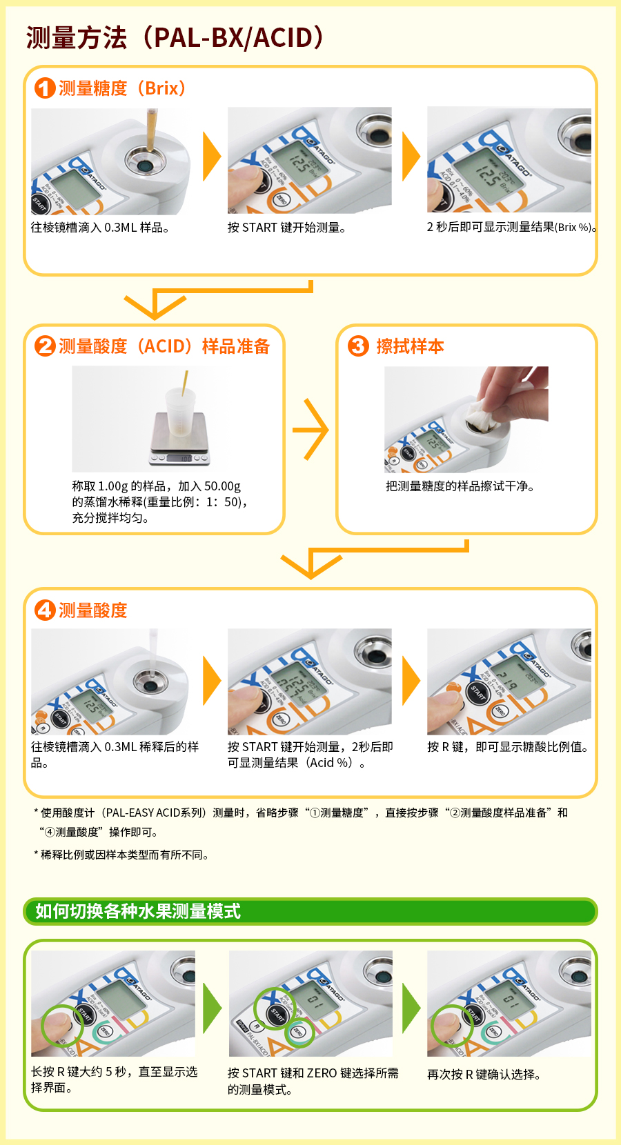 使用ATAGO(愛拓)糖酸度計,糖度可直接取樣測量;酸度測量只需添加蒸餾水與測量樣品按重量比例(1:50)稀釋(即:果汁1ml,蒸餾水50ml)攪拌均勻后即可取樣測量。糖度及酸度測量完成后,按R鍵自動顯示糖酸比。