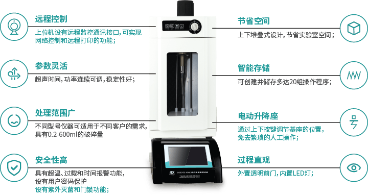 • 處理范圍廣 不同型號(hào)儀器可適用于不同客戶(hù)的需求,具有0.2-600ml的破碎量