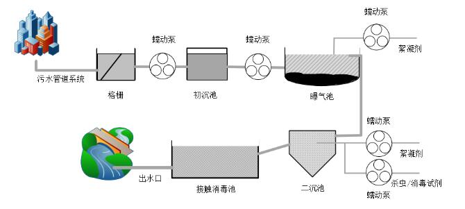 蘭格蠕動(dòng)泵產(chǎn)品在水處理系統(tǒng)中用于傳輸待處理的污水,或用于添加絮凝劑以及其他水處理試劑。