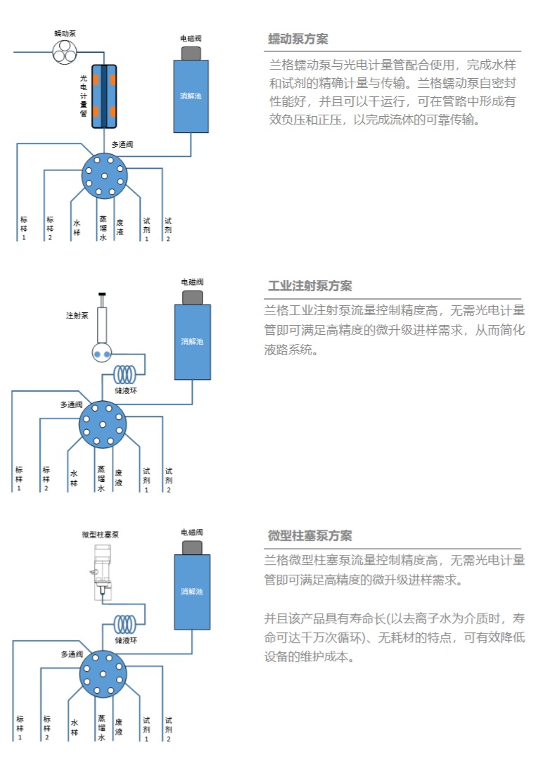 在在線水質(zhì)檢測系統(tǒng)中,蘭格產(chǎn)品主要用于傳輸待檢測水樣,以及各種檢測試劑。蘭格可提供不同種類的精密泵解決方案:蠕動(dòng)泵、工業(yè)注射泵和微型柱塞泵,以滿足不同檢測系統(tǒng)的需求。