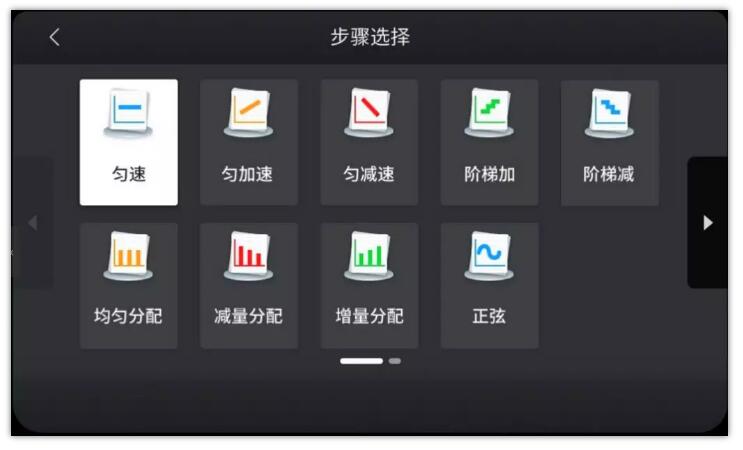 運行步驟一共有九個,包括:勻速、勻加速、勻減速、階梯加、階梯減、均勻分配、減量分配、增量分配和正弦曲線傳輸。