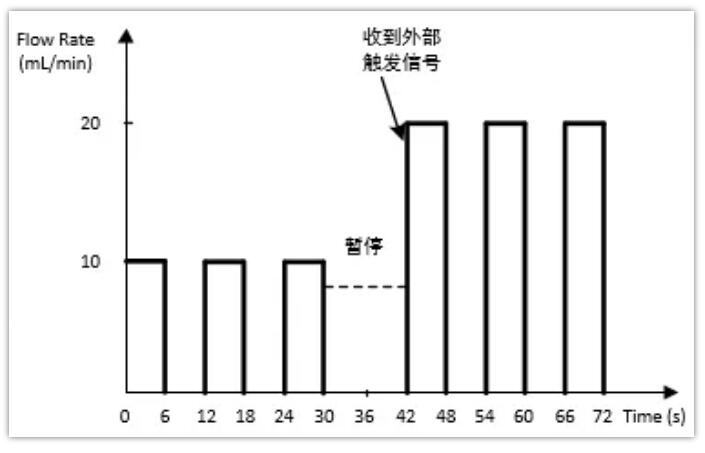 方案內(nèi)容:以10mL/min的流量灌裝6秒(灌裝量為1mL),灌裝3次(間隔6秒),暫停;待收到外部觸發(fā)信號后,以20mL/min的流量灌裝6秒(灌裝量為2mL),灌裝3次(間隔6秒),停止。