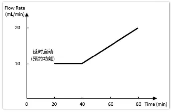方案內(nèi)容:延時20分鐘啟動泵,以10mL/min流量運行20分鐘,之后流量線性遞增,在40分鐘內(nèi)流量從10mL/min遞增至20mL/min。