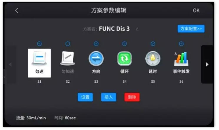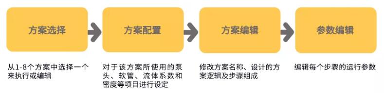 在方案參數(shù)編輯界面可以對方案名稱進行建立和修改,也可編程方案的構(gòu)架(增加或刪除步驟),還可以對設(shè)定的步驟進行使能選擇。