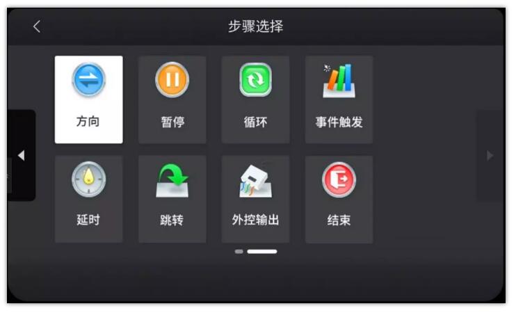而邏輯步驟一共有八個,包括:方向、暫停、循環(huán)、事件觸發(fā)、延時、跳轉(zhuǎn)、外控輸出和結(jié)束。